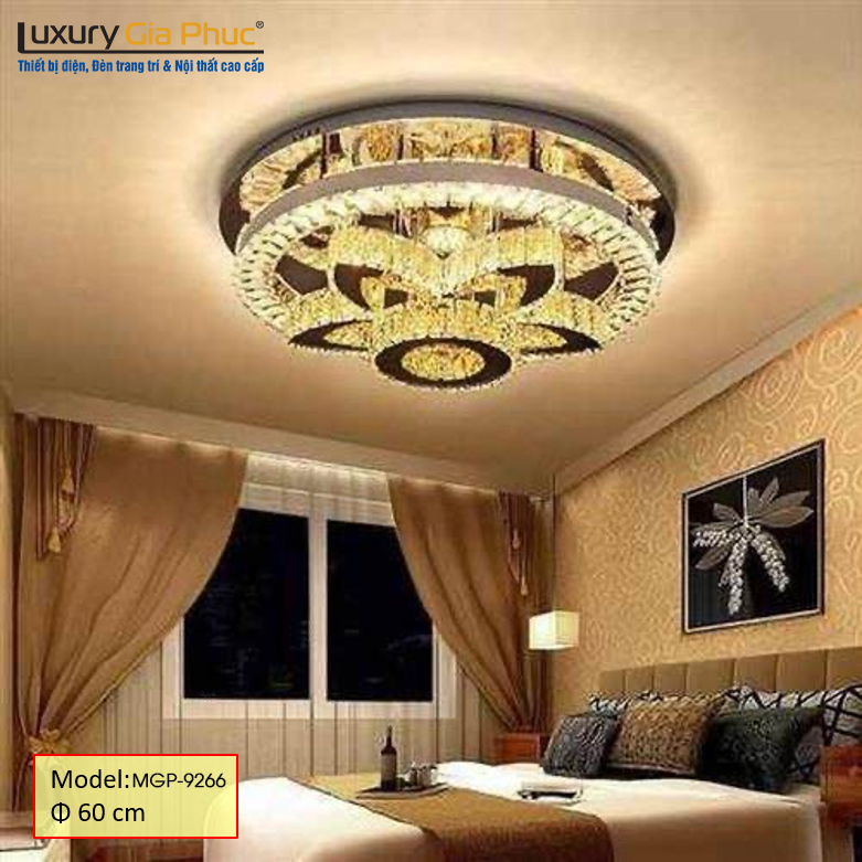 - Về chất liệu: Đèn mâm pha lê MGP-9266 thiết kế và sản xuất tại Việt Nam bởi Đèn Chùm Gia Phúc với Pha le K9 nhập khẩu từ Ai Cập. Đây là dòng pha lê cao cấp có độ bền cao, pha lê trong suốt lấp lánh, độ phản sáng cao.